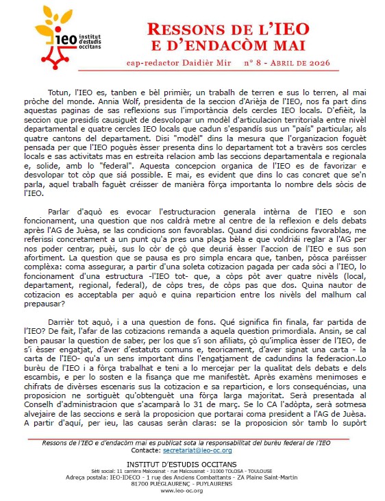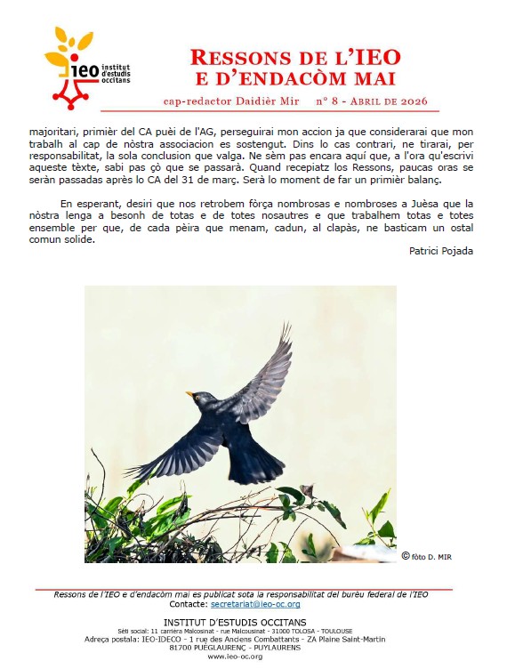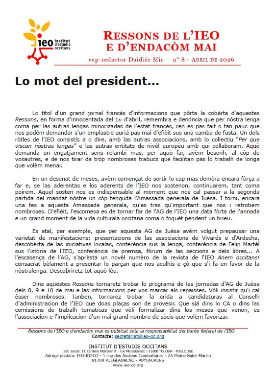 Ai lo plaser de vos adreçar lo nòstre numèro 8 tot bèl just sortit de nòstres ordinators flame nòus, una primièra per aqueste mes d’abril : son estats realizats de cap en cima per l’intelligénca artificiala que, ara es capabla de mestrejar totas las variantas de nòstra lenga. Aprofiecham aquela avançada tecnologica per vos anonciar que los Ressons vendràn desenant, quotidians emai biquotidians se l’actualitat occitana o reclama.
