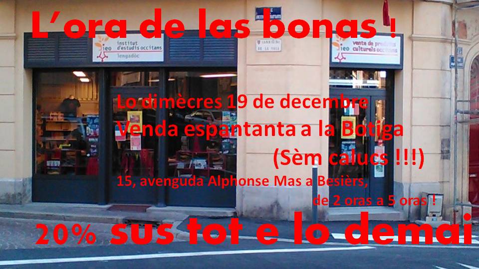 Es l’ora de las bonas a Besièrs aqueste dimècres 19 de decembre, lo mond van dire que sèm tocats per la coa de l’anhèla, rai…20% sus tot e sus lo demai !