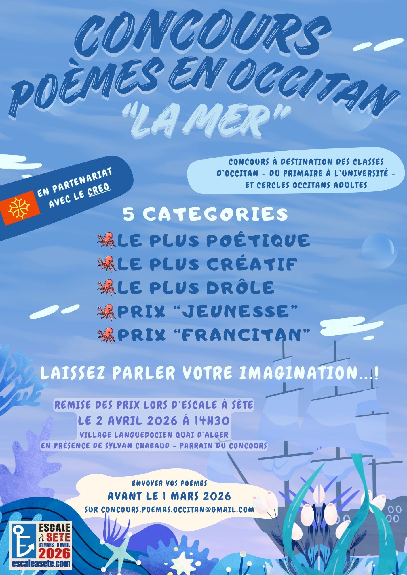 Chères enseignantes, chers enseignants, à l’occasion d’Escale à Sète 2026, les organisateurs du village Languedocien, en partenariat avec le CREO Lengadòc, ont le plaisir de vous proposer un concours de poèmes en occitan sur le thème : “La Mer”.