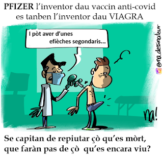 Me daissère dire que Pfizer es tanben l’inventor dau Viagrà e aquí i a pas digús que repoteguèt contra las consequéncias indesirablas. Tè, i anère per espinchar, au vaccinodròme de Vailhauqués, a cò dels pompiers. I a un viralum que se vei de luònh, un viralum roge e de mond aquí dedins, a la coa lanlèra, una coeta longassa, que s’estira…