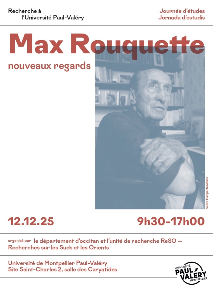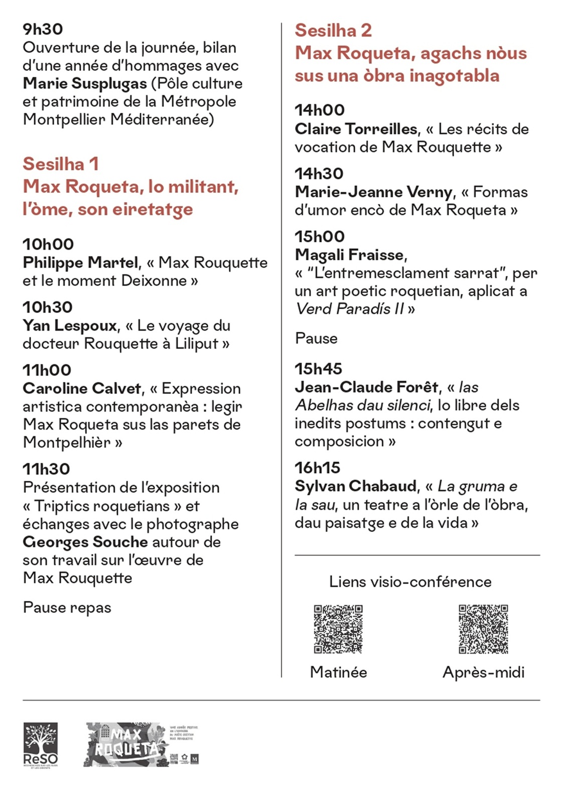 Liens visio-conférence / Matinée : https://pod.univ-montp3.fr/meeting/2112-je-roqueta-matinada/17b857ae1656306067fa8fc165df73c839ee2d2c3791ef6770cdfae42614e19c