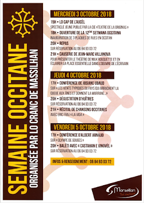 Coma d’acostumat en aquesta debuta d’octobre lo Cranc de Massilhan a porgit al mond de la vila e mai als afogats de la lenga e de la cultura occitanas dels alentors, una polida tièra de manifestacions. L’inauguracion amb la municipalitat foguèt l’escasença de desvelar de placas de carrièras novèlas en occitan. Puèi lo Teatre de las Originas pivelèt los mainatges amb una fadariá ecologica, Cap a l’aucèl. Los adults o foguèron tan coma eles dins una serada de meravilha a l’escota d’ Eric Fraj. Lo teatre de Max Roqueta foguèt presentat amb la passion qu’òm li coneis per Joan Marc Vilanòva. Josiana Ubaud faguèt bufar los vents d’aicí e Albèrt Arnaud revelèt la personalitat apassionada e apassionanta d’Olympe de Gouges, pionièra dels combats feministas. Una capitada chanuda aquesta 12e Setmana que ven de dobrir una annada novèla.d’activtat pel Cranc. Pas tròp escrancar encara lo Cranc que festejarà sas 40 annadas d’existéncia en 2019.