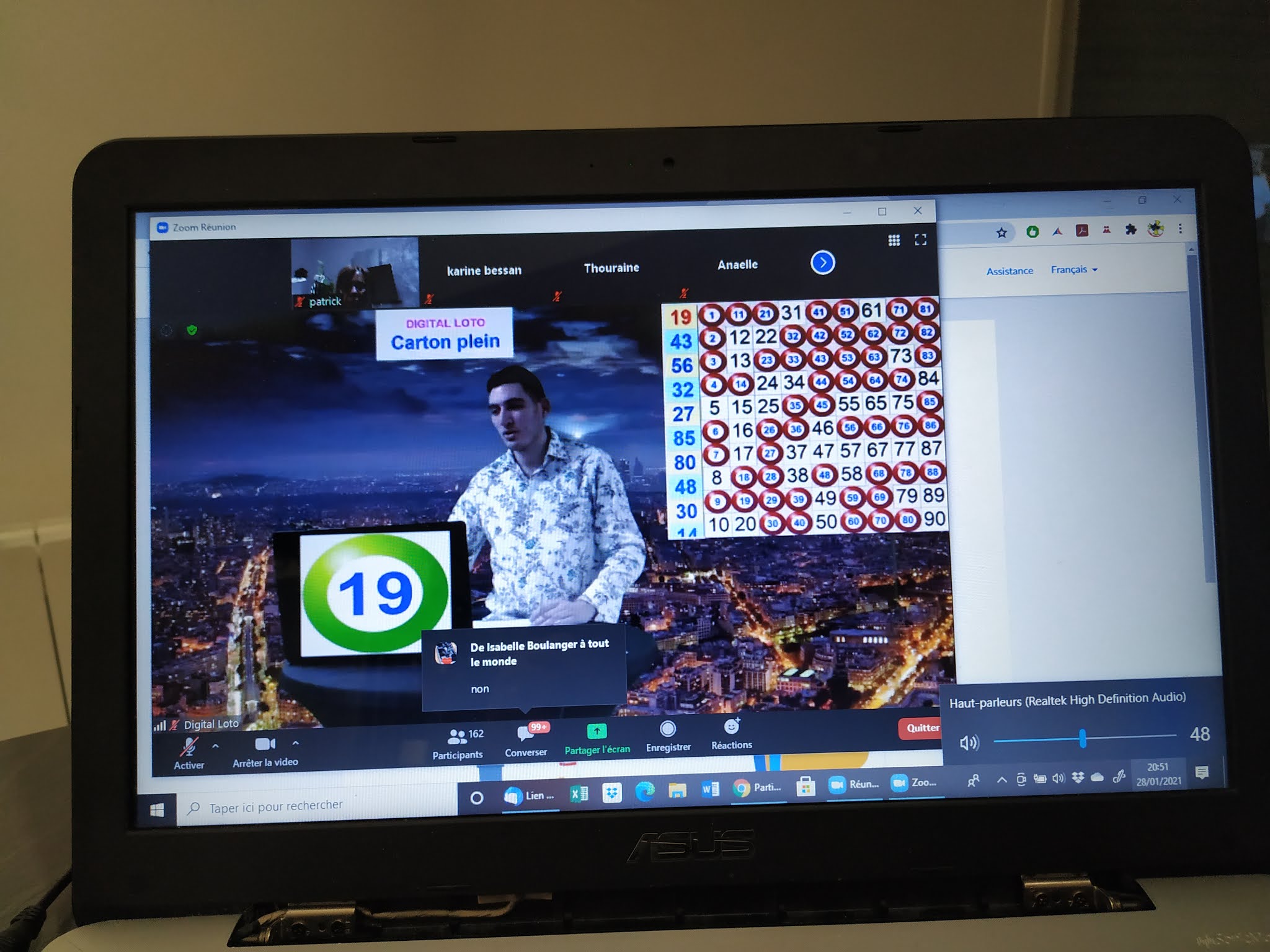 Le jour du loto, une 1/2h avant, un lien vous sera envoyé, vous vous connectez. Lien ZOOM